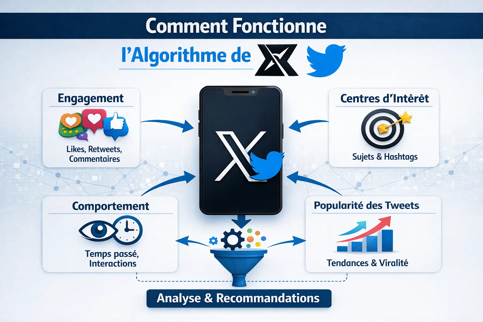 L’algorithme de X (Twitter) n’est pas une boîte noire : c’est un système de scoring qui valorise les conversations authentiques, le temps de lecture et la vélocité d’engagement. En comprenant ses mécaniques et en adaptant votre stratégie, vous pouvez considérablement augmenter votre portée organique en 2026.